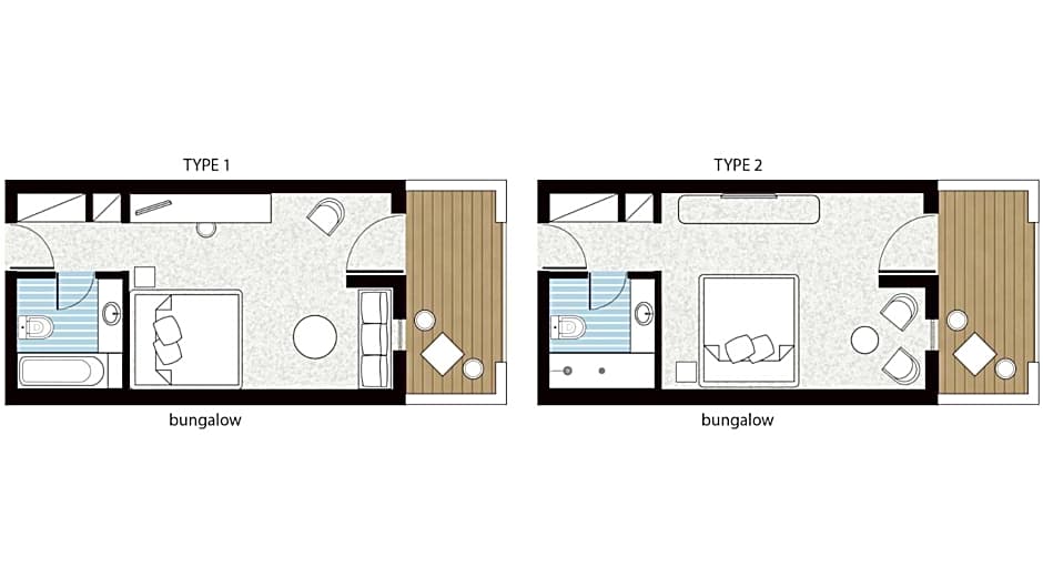 Exclusive Bungalow Suite with Hydro-massage is 215 square feet and includes a queen-size bed 150-154 width.